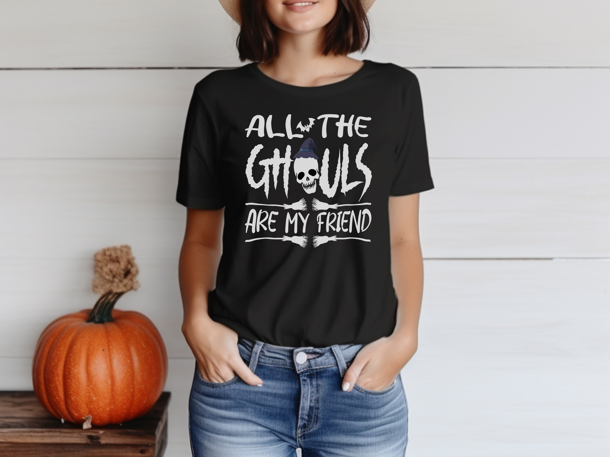 💀 Spooky season = best friend season! This Halloween shirt features the fun phrase All The Ghouls Are My Friend in creepy dripping letters, paired with a skull in a witch hat 🧙, flying bats 🦇, and broomsticks for a bold + playful vibe. Perfect for Halloween parties, classrooms, or just showing your spooky spirit all fall long.