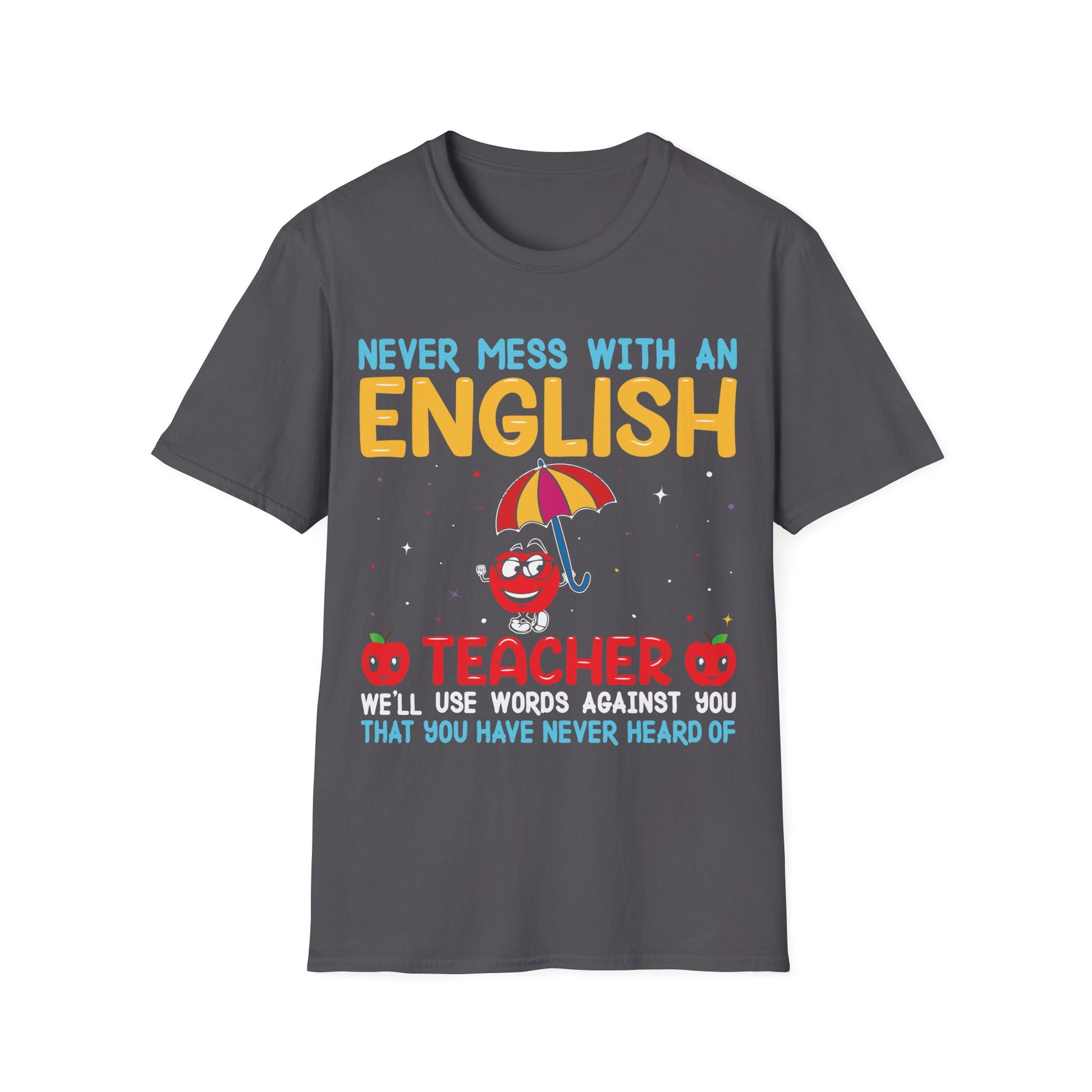 📚 Make a bold (and hilarious) statement with this Never Mess With an English Teacher t-shirt! Featuring a smiling apple character, colorful text, and the witty phrase: “We’ll use words against you that you have never heard of,” this design is perfect for English teachers who love a clever pun.