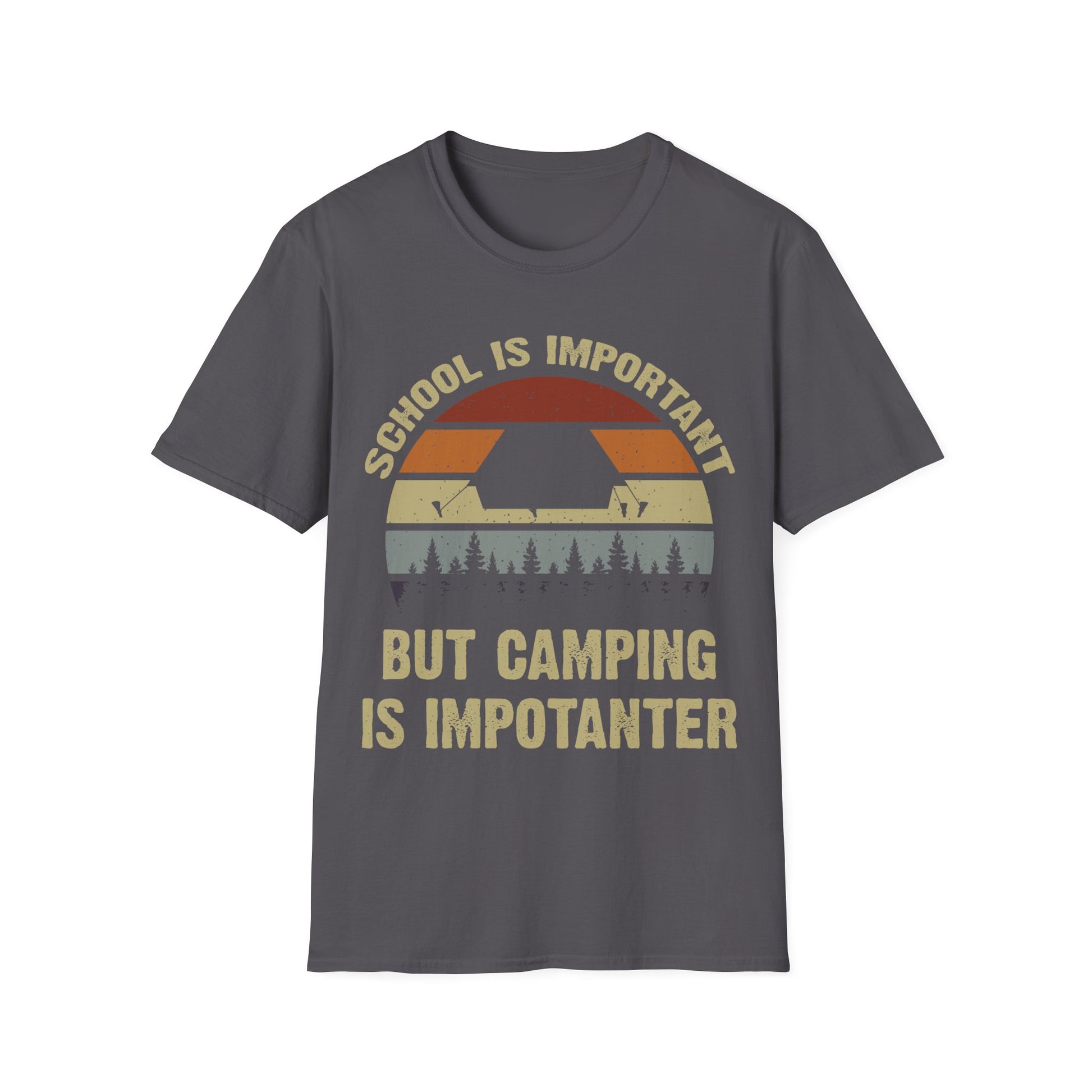 🌲 Hit the outdoors with a laugh in this School Is Important But Camping Is Importanter t-shirt! Featuring a retro sunset backdrop, tent silhouette, and forest trees, this funny camping tee is perfect for campers, hikers, and anyone who’d rather be outdoors than in a classroom. A witty, lighthearted design that makes a great gift for camping lovers of all ages.