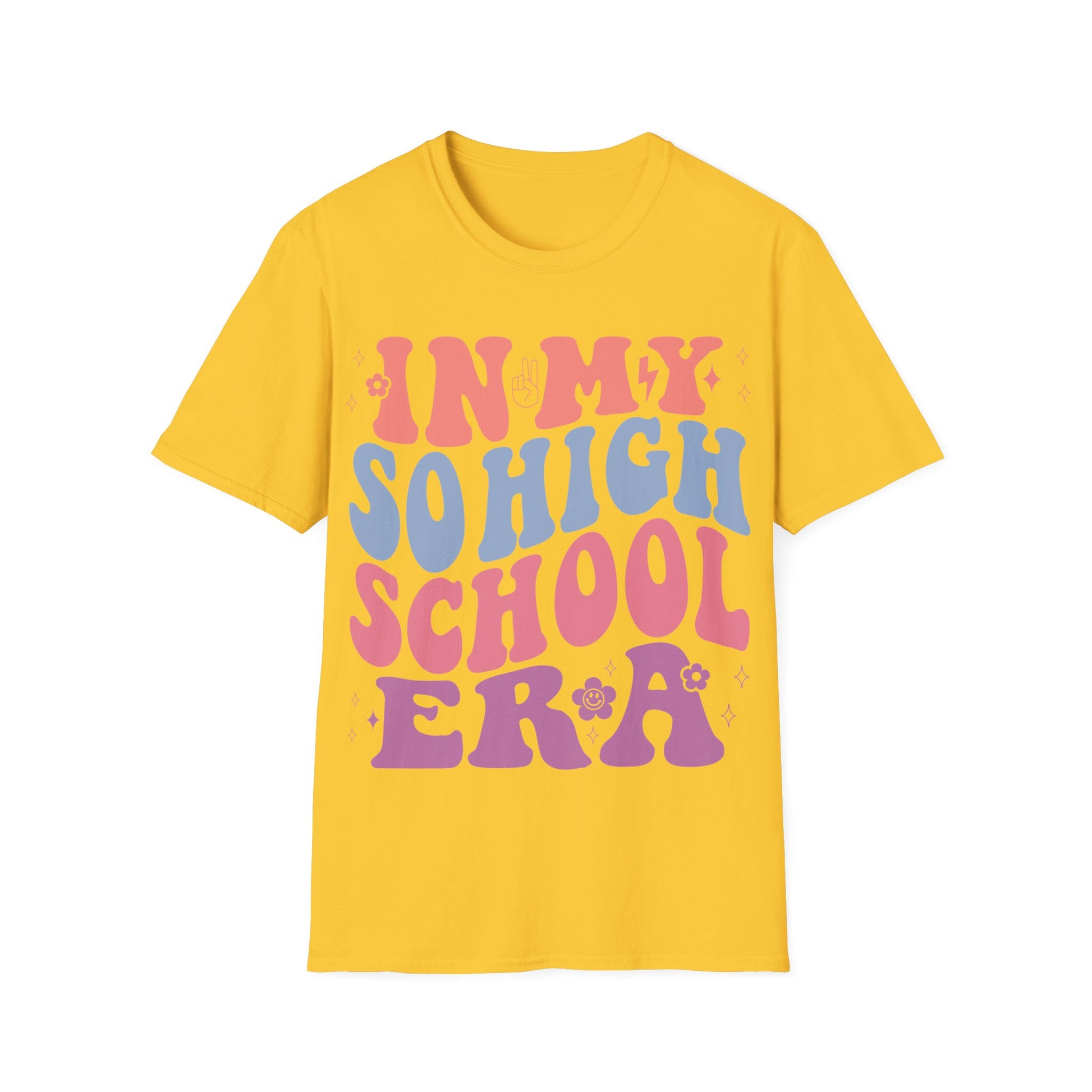 💖 Live your “So High School” moment in style! This retro-inspired tee features bold, groovy bubble letters in pastel pink, purple, and blue with playful icons like ✌️ peace signs, sparkles ✨, and smiley flowers 🌸.